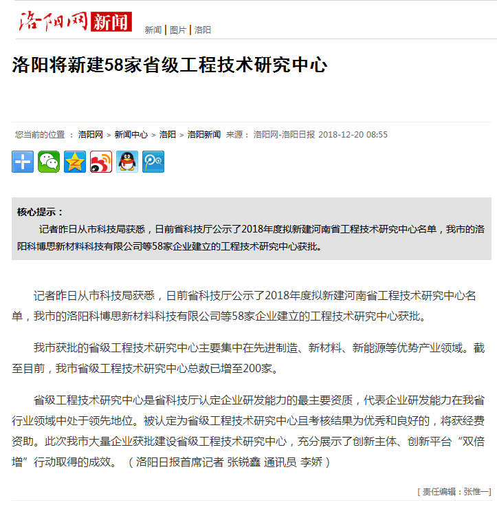 日前,省科技局公示2018年度擬建河南省工程技術(shù)中心名單,洛陽科博思新材料科技有限公司榜上有名。省級(jí)工程技術(shù)研究中心是省科技廳認(rèn)定企業(yè)研發(fā)能力的最主要資質(zhì),代表企業(yè)研發(fā)能力在我省行業(yè)領(lǐng)域中處于領(lǐng)先地位??撇┧即舜潍@批省級(jí)工程技術(shù)研究中心,是省科技廳對(duì)科博思科研實(shí)力和科研平臺(tái)的肯定。